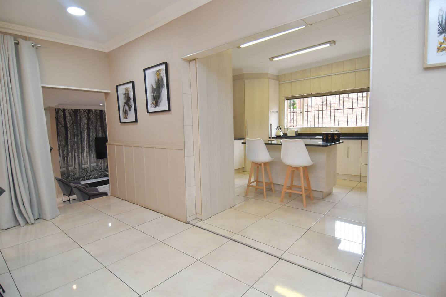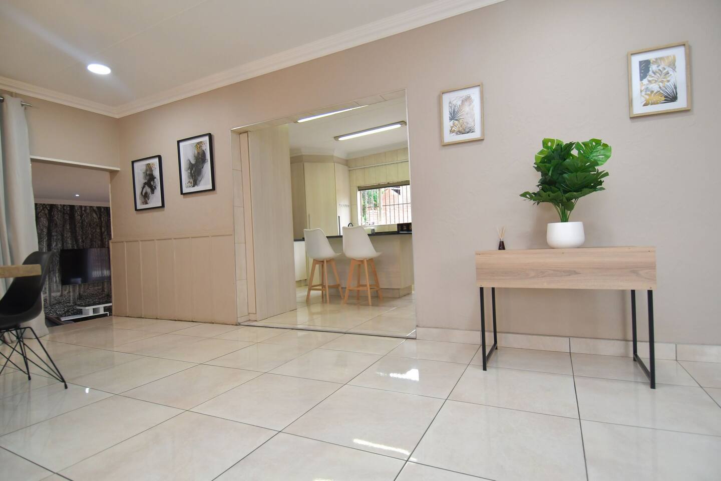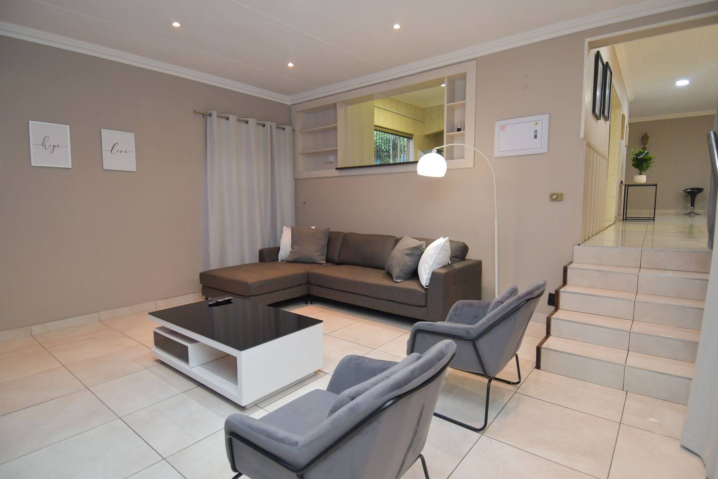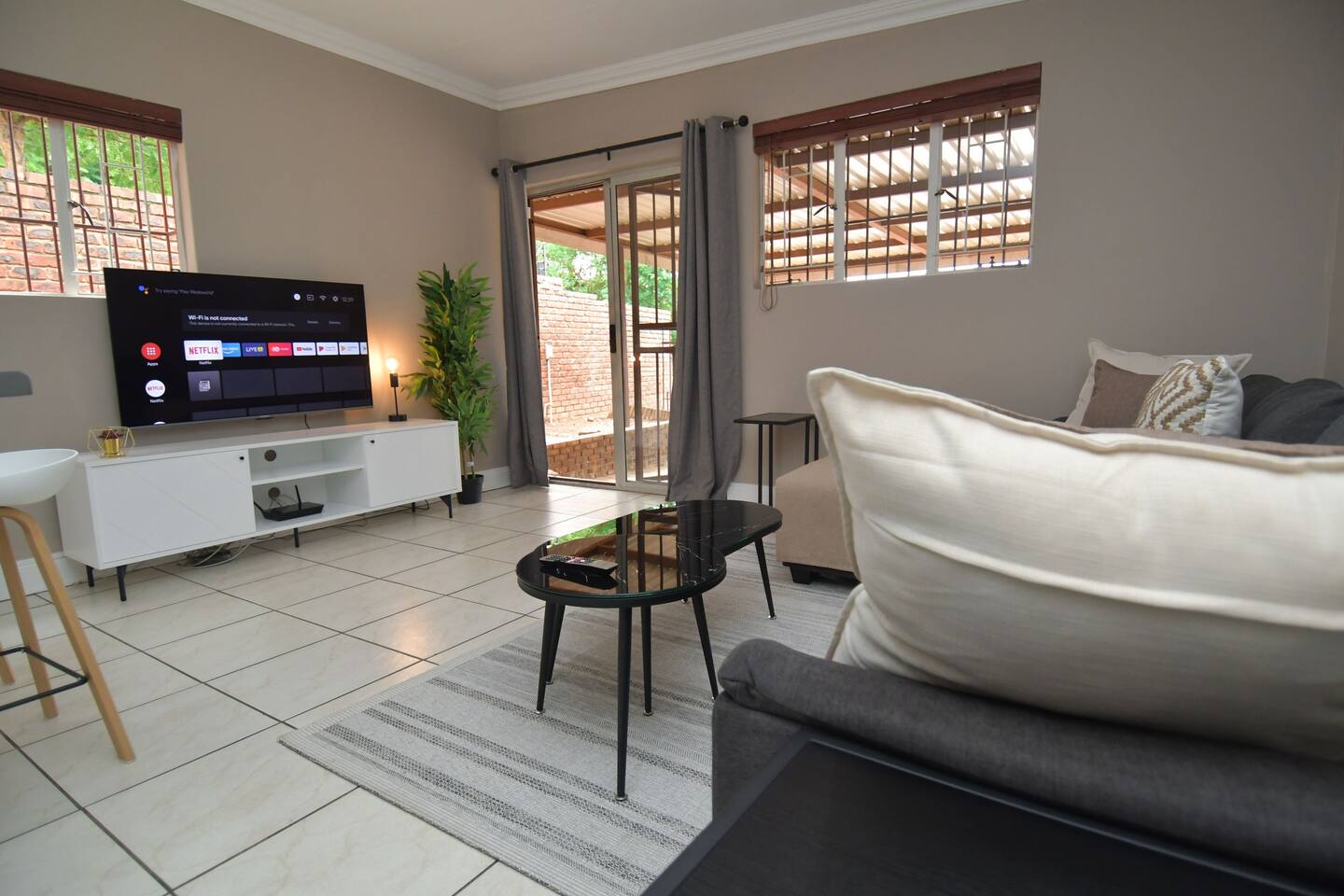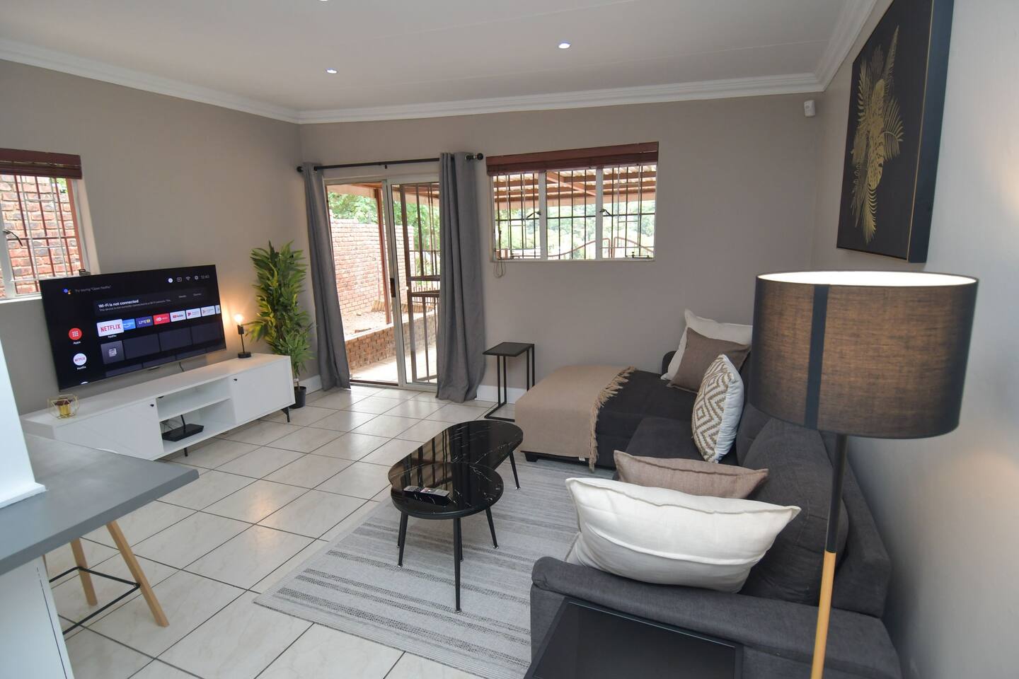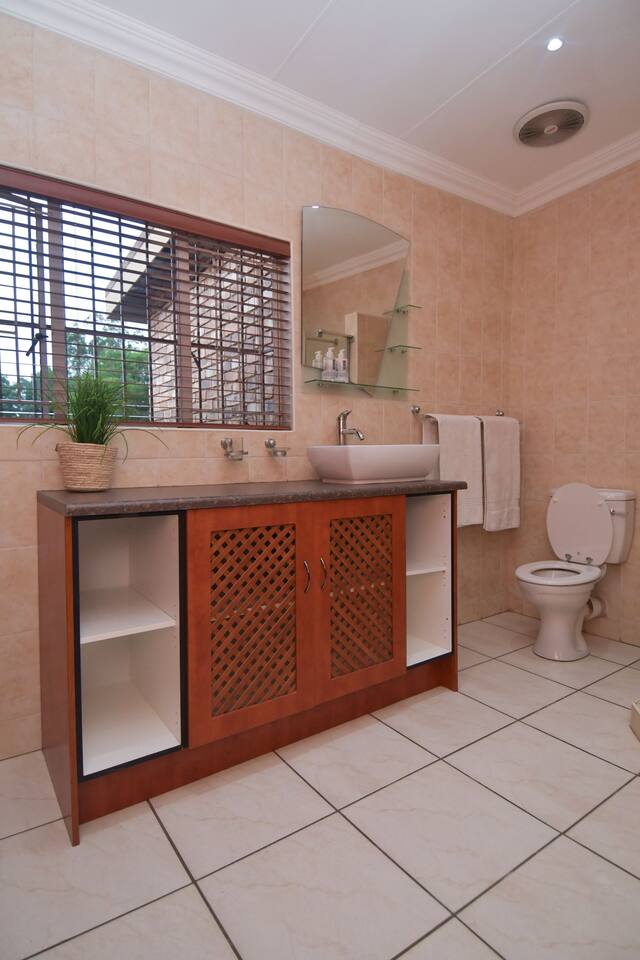Soak up the modern and contemporary charm of this newly renovated and spacious home. Enjoy your stay without worrying about power outages as our property is equipped with a generator to keep lights, TV and essential appliances in working order. Play your favorite shows or music on Netflix, YouTube premium or DSTV on 2 TVs (65 and 55inch) via voice commands, all facilitated by a high speed (50mbps) uncapped and unshaped internet connection. Use you voice to turn on/off the lights as you please or have them turn on automatically in the morning to wake you up. Enjoy access to 2 living rooms, 2 kitchens and a gorgeous dining room. A full self catering unit is included if privacy is required within your group. The unit comes fully equipped with it's own living area, bedroom and bathroom. The house is cleaned and serviced 2 times a week at no additional cost. Sleep in bedrooms overlooking a beautiful garden, equipped with air conditioners and high quality mattresses while our fine bedding will carress you into a night of peaceful sleep.