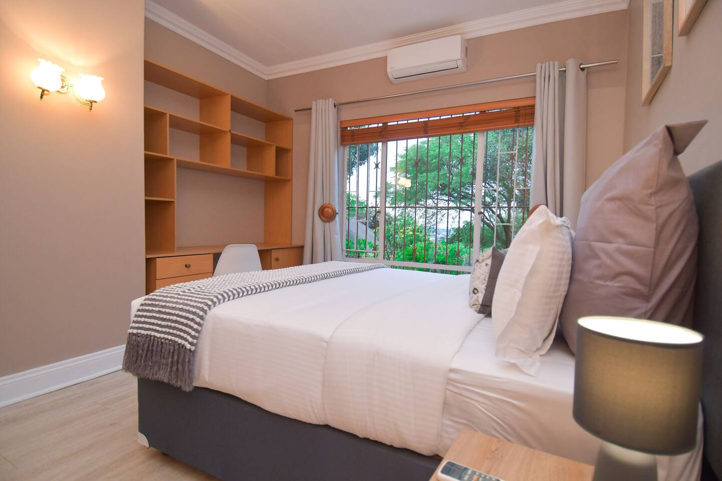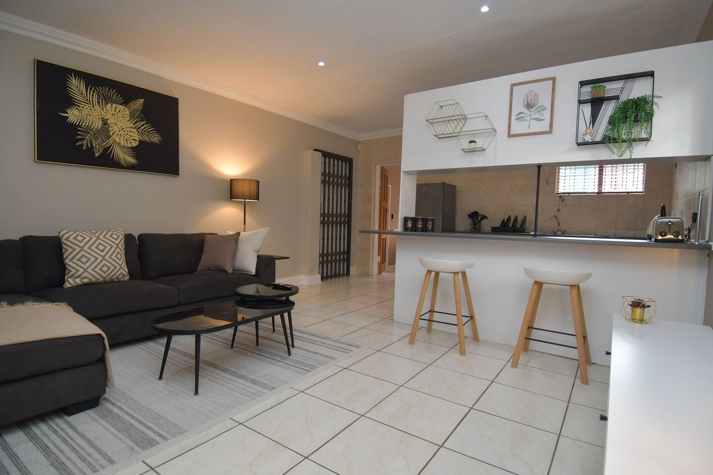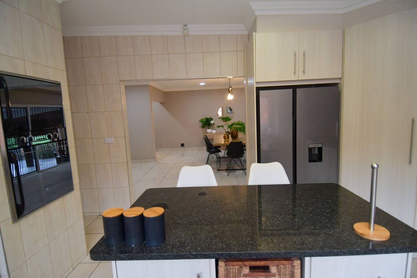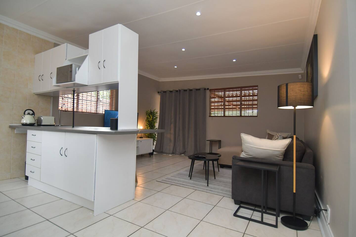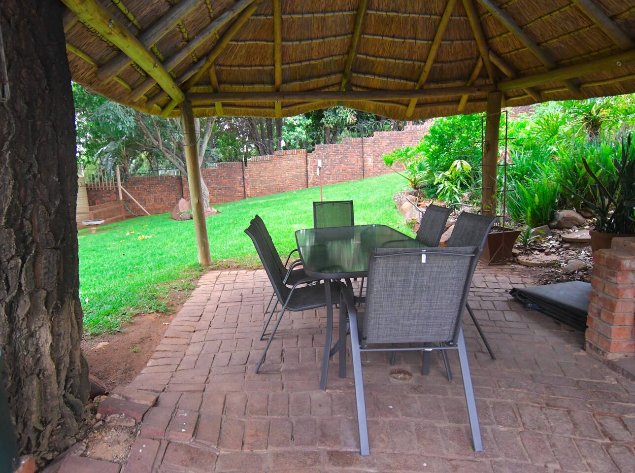 Soak up the modern and contemporary charm of this newly renovated and spacious home. Enjoy your stay without worrying about power outages as our property is equipped with a generator to keep lights, TV and essential appliances in working order. Play your favorite shows or music on Netflix, YouTube premium or DSTV on 2 TVs (65 and 55inch) via voice commands, all facilitated by a high speed (50mbps) uncapped and unshaped internet connection. Use you voice to turn on/off the lights as you please or have them turn on automatically in the morning to wake you up. Enjoy access to 2 living rooms, 2 kitchens and a gorgeous dining room. A full self catering unit is included if privacy is required within your group. The unit comes fully equipped with it's own living area, bedroom and bathroom. The house is cleaned and serviced 2 times a week at no additional cost. Sleep in bedrooms overlooking a beautiful garden, equipped with air conditioners and high quality mattresses while our fine bedding will carress you into a night of peaceful sleep.