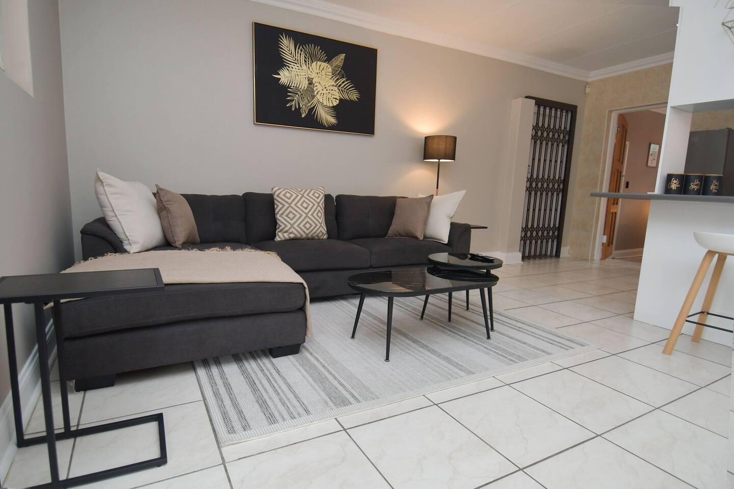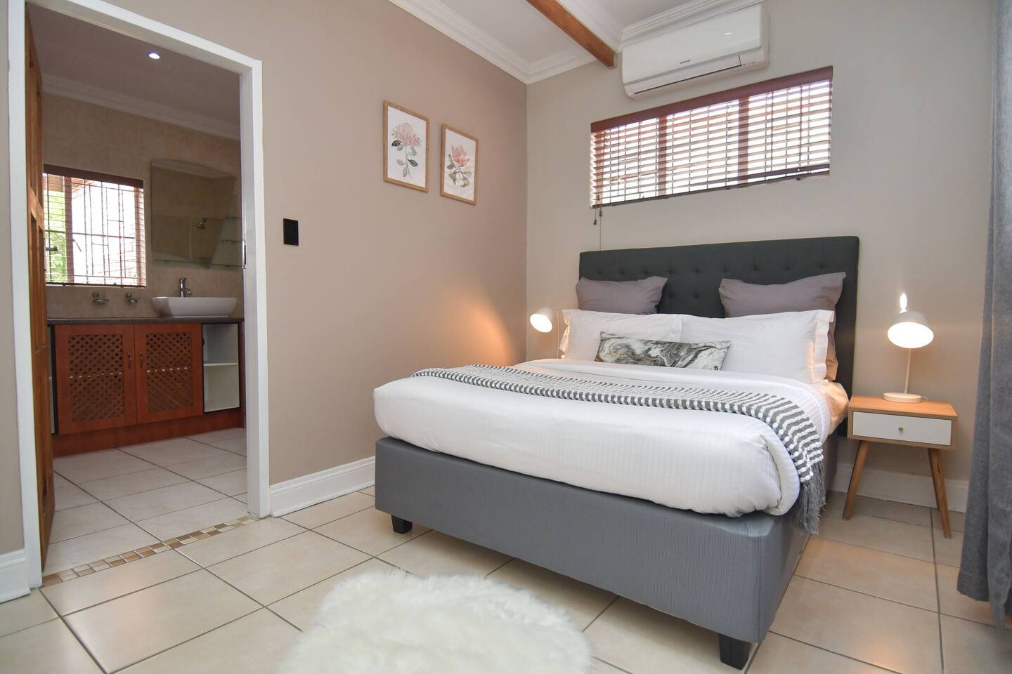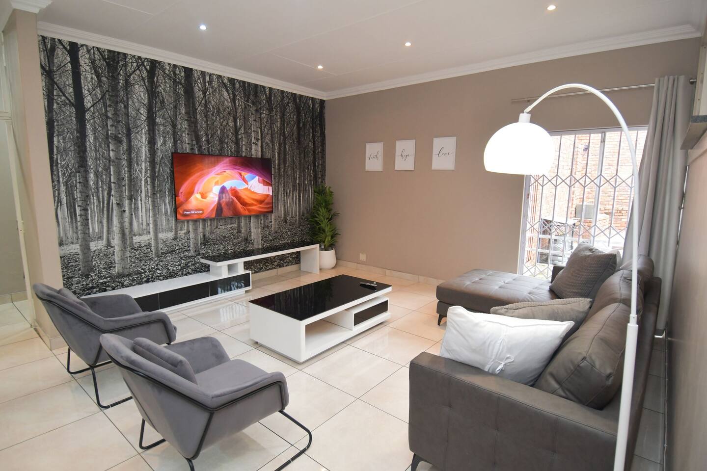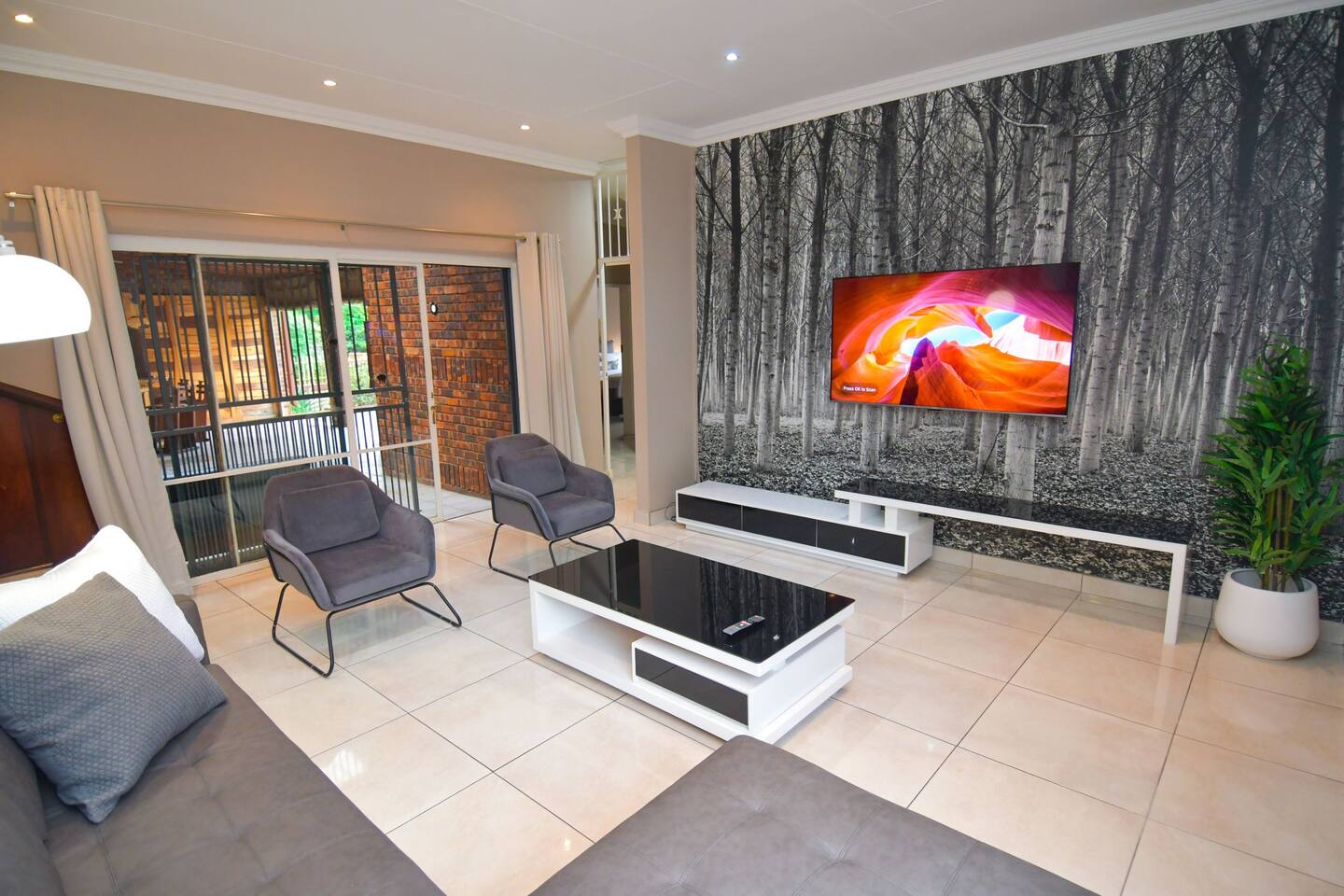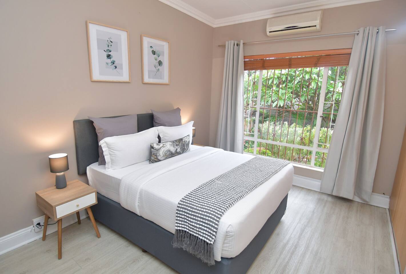 Soak up the modern and contemporary charm of this newly renovated and spacious home. Enjoy your stay without worrying about power outages as our property is equipped with a generator to keep lights, TV and essential appliances in working order. Play your favorite shows or music on Netflix, YouTube premium or DSTV on 2 TVs (65 and 55inch) via voice commands, all facilitated by a high speed (50mbps) uncapped and unshaped internet connection. Use you voice to turn on/off the lights as you please or have them turn on automatically in the morning to wake you up. Enjoy access to 2 living rooms, 2 kitchens and a gorgeous dining room. A full self catering unit is included if privacy is required within your group. The unit comes fully equipped with it's own living area, bedroom and bathroom. The house is cleaned and serviced 2 times a week at no additional cost. Sleep in bedrooms overlooking a beautiful garden, equipped with air conditioners and high quality mattresses while our fine bedding will carress you into a night of peaceful sleep.