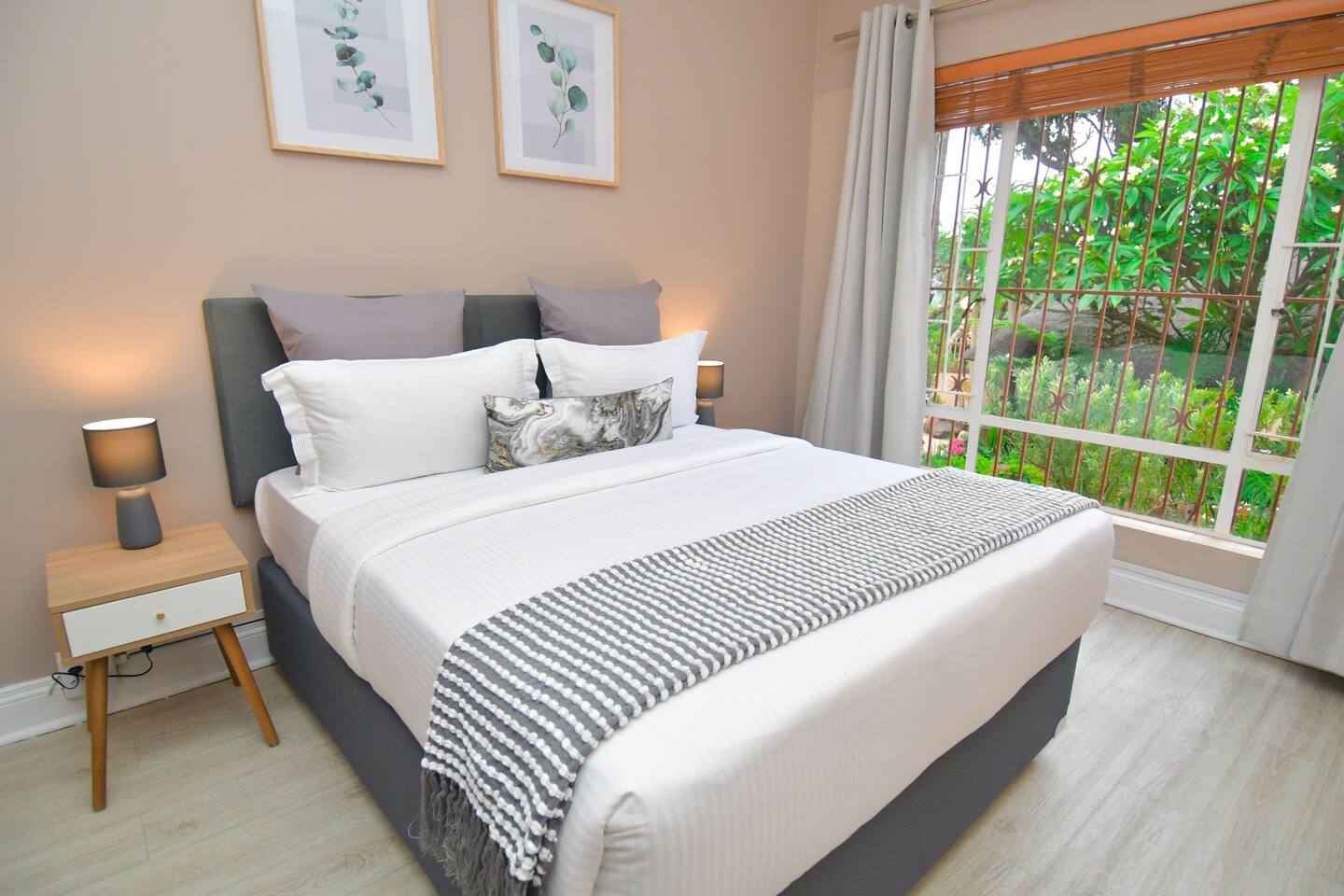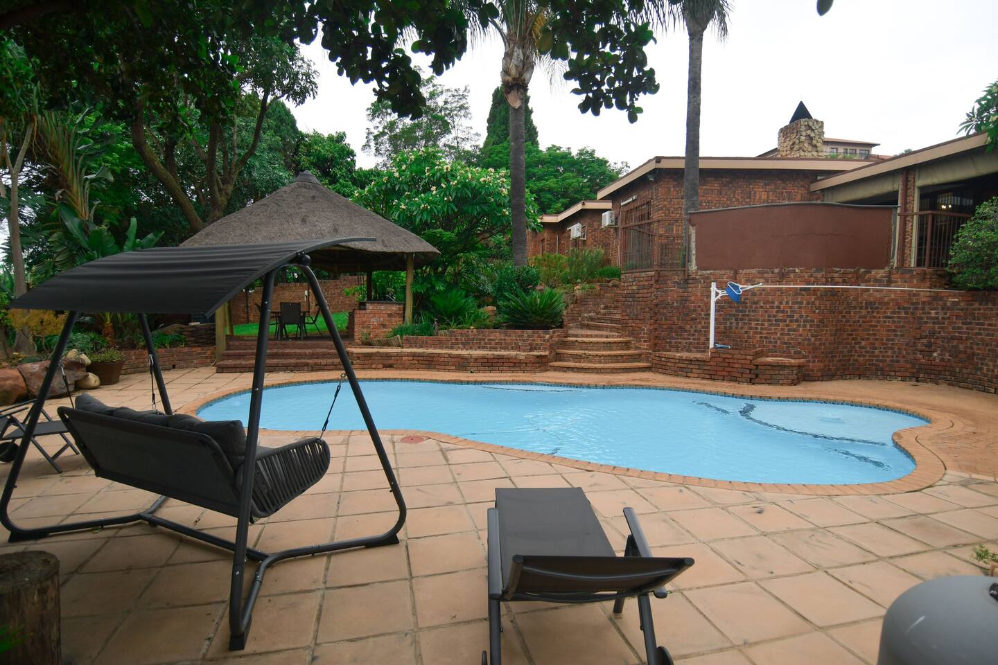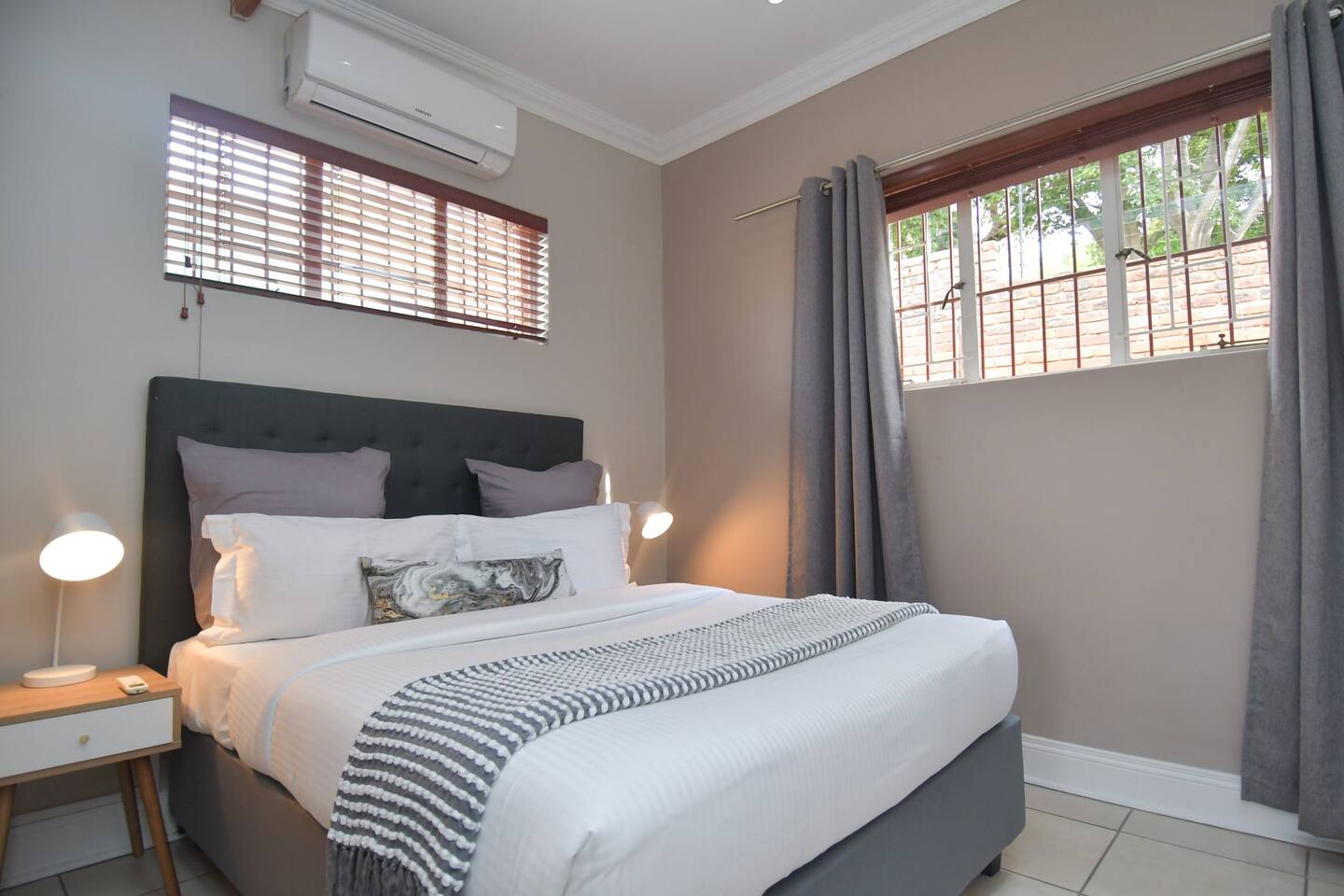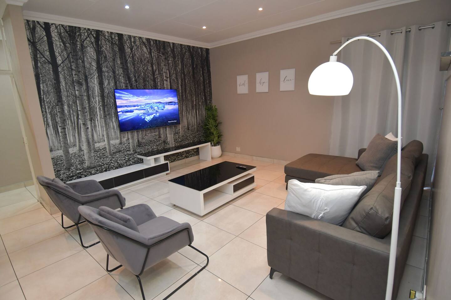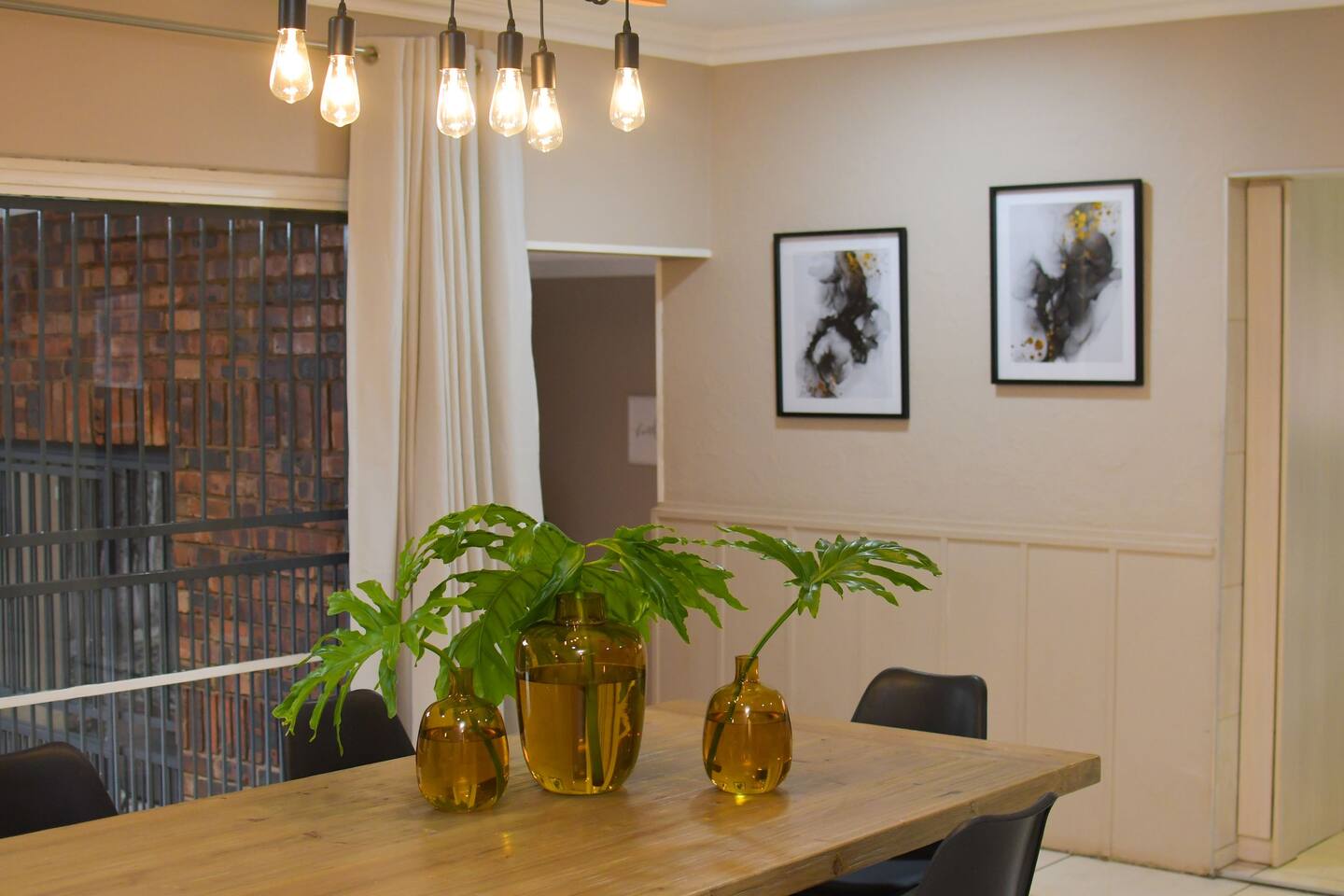 Soak up the modern and contemporary charm of this newly renovated and spacious home. Enjoy your stay without worrying about power outages as our property is equipped with a generator to keep lights, TV and essential appliances in working order. Play your favorite shows or music on Netflix, YouTube premium or DSTV on 2 TVs (65 and 55inch) via voice commands, all facilitated by a high speed (50mbps) uncapped and unshaped internet connection. Use you voice to turn on/off the lights as you please or have them turn on automatically in the morning to wake you up. Enjoy access to 2 living rooms, 2 kitchens and a gorgeous dining room. A full self catering unit is included if privacy is required within your group. The unit comes fully equipped with it's own living area, bedroom and bathroom. The house is cleaned and serviced 2 times a week at no additional cost. Sleep in bedrooms overlooking a beautiful garden, equipped with air conditioners and high quality mattresses while our fine bedding will carress you into a night of peaceful sleep.