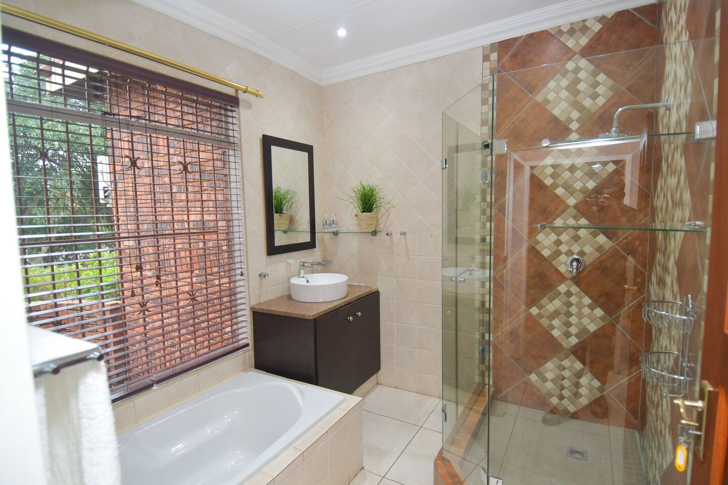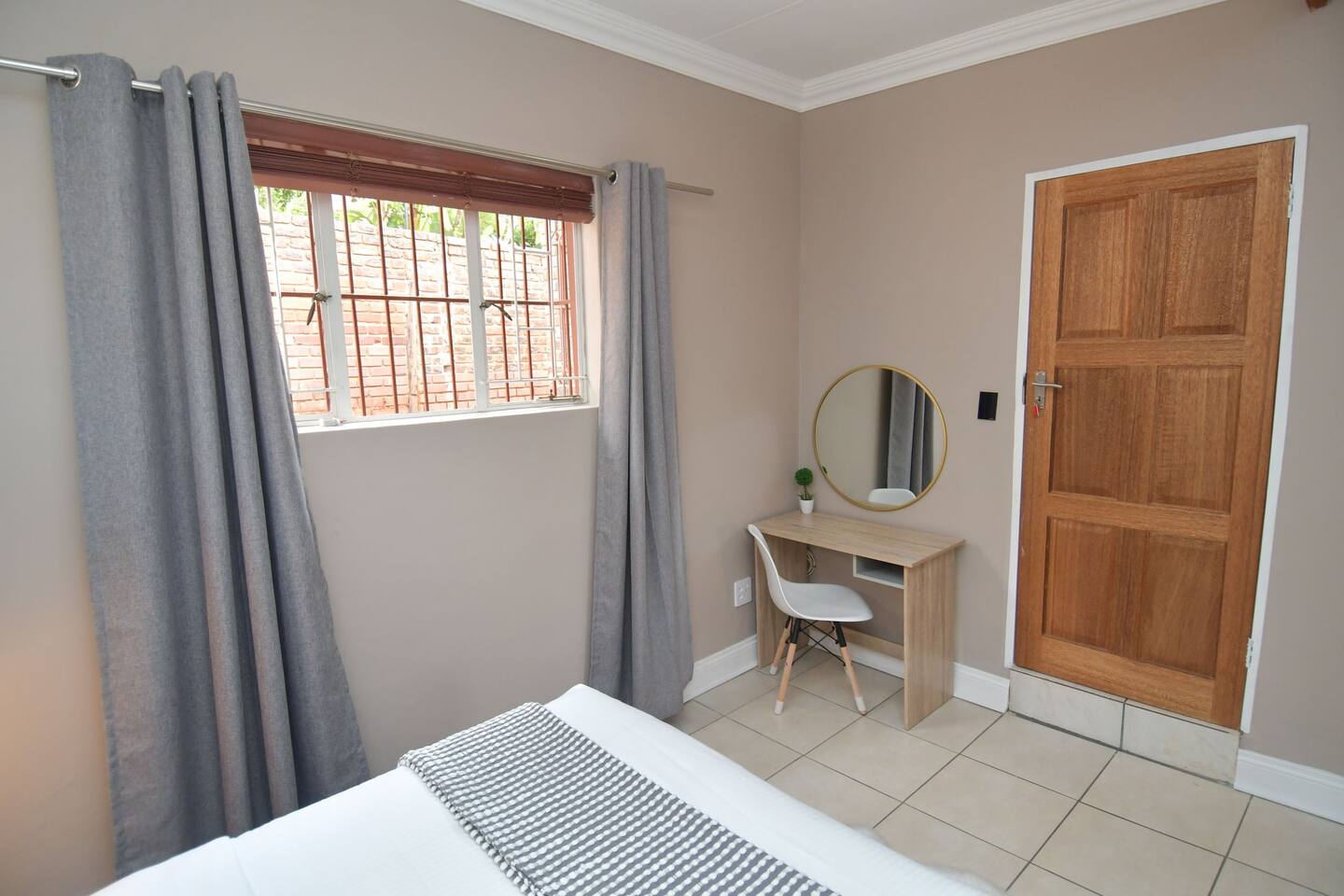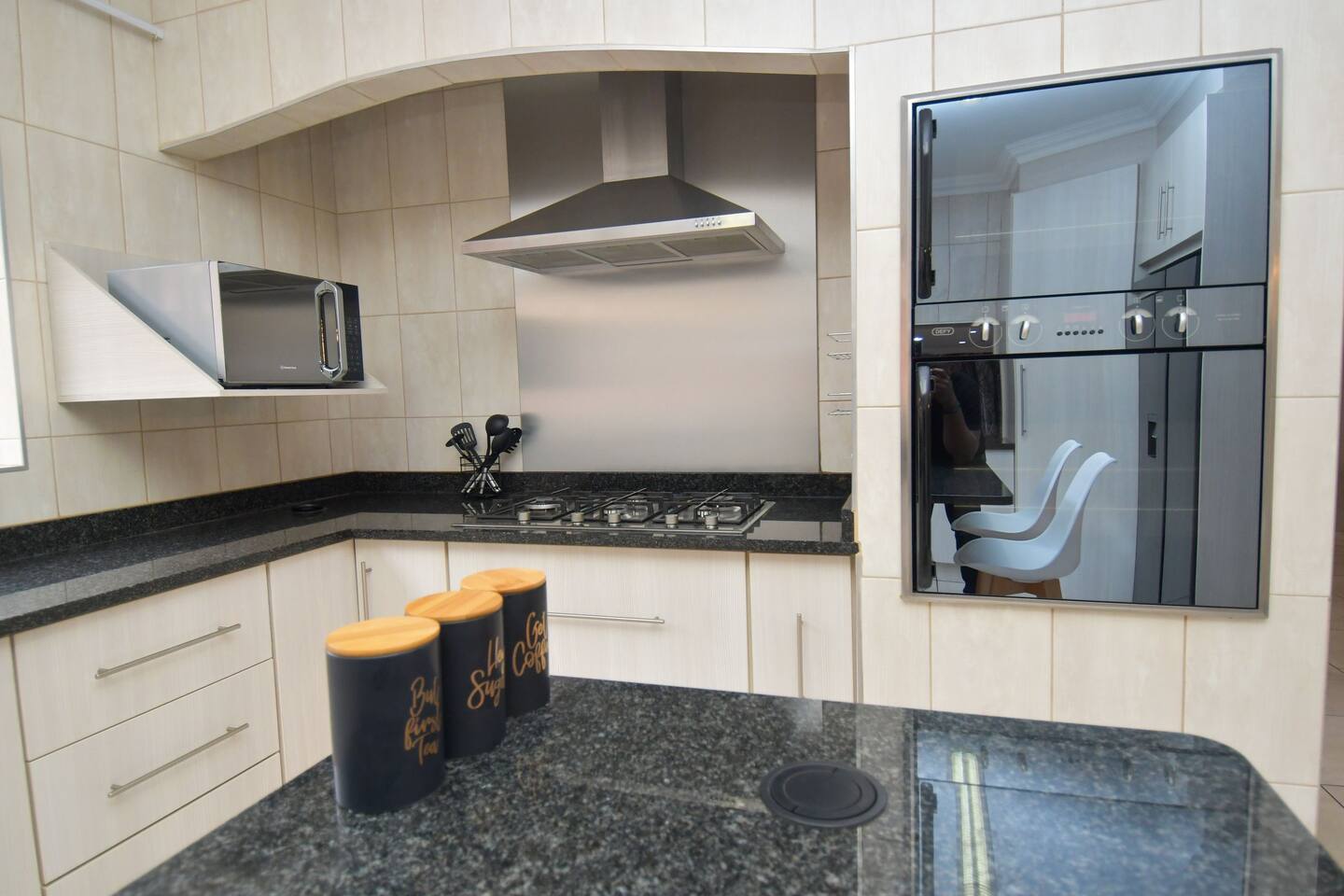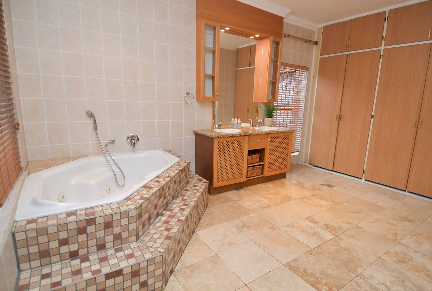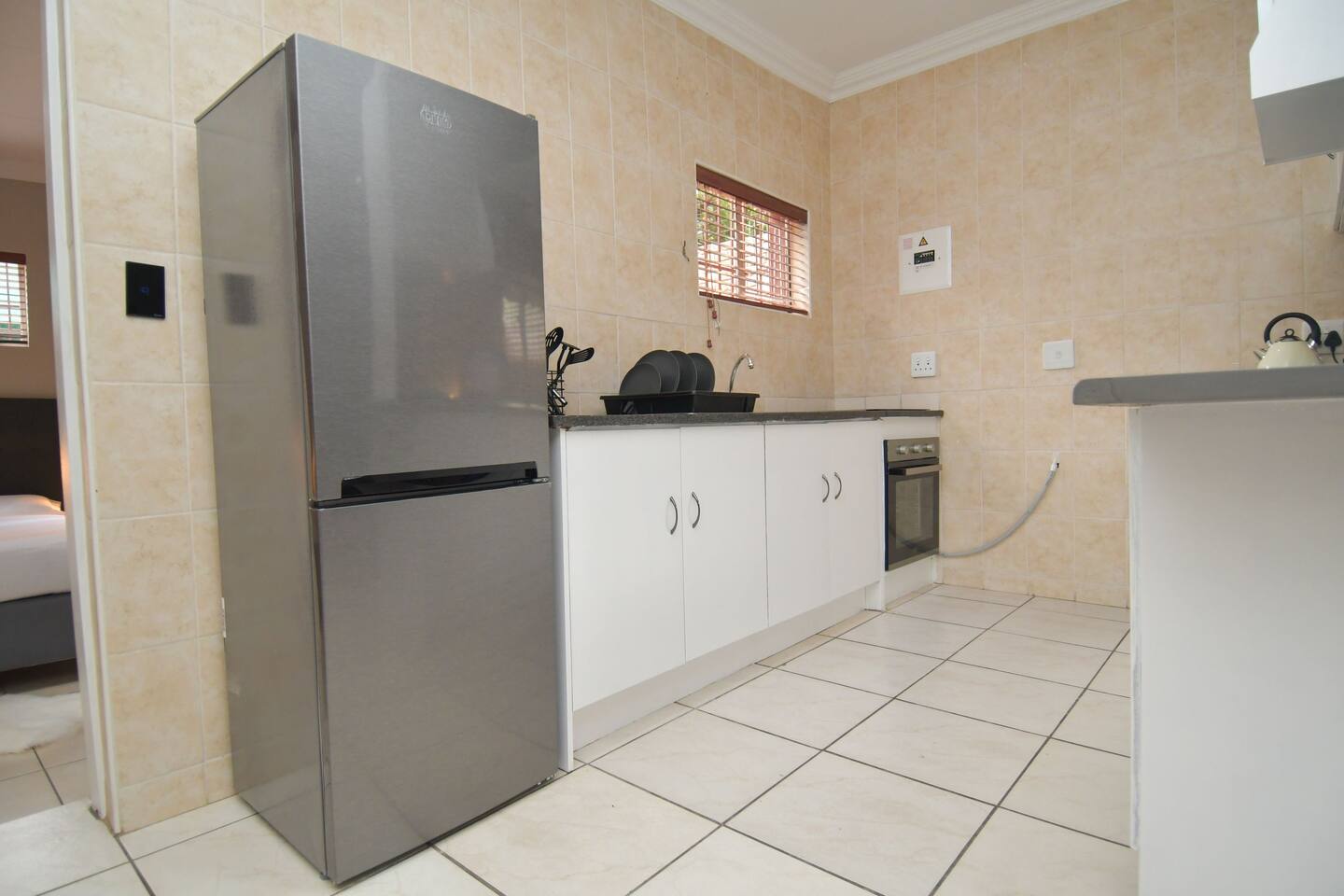 Soak up the modern and contemporary charm of this newly renovated and spacious home. Enjoy your stay without worrying about power outages as our property is equipped with a generator to keep lights, TV and essential appliances in working order. Play your favorite shows or music on Netflix, YouTube premium or DSTV on 2 TVs (65 and 55inch) via voice commands, all facilitated by a high speed (50mbps) uncapped and unshaped internet connection. Use you voice to turn on/off the lights as you please or have them turn on automatically in the morning to wake you up. Enjoy access to 2 living rooms, 2 kitchens and a gorgeous dining room. A full self catering unit is included if privacy is required within your group. The unit comes fully equipped with it's own living area, bedroom and bathroom. The house is cleaned and serviced 2 times a week at no additional cost. Sleep in bedrooms overlooking a beautiful garden, equipped with air conditioners and high quality mattresses while our fine bedding will carress you into a night of peaceful sleep.