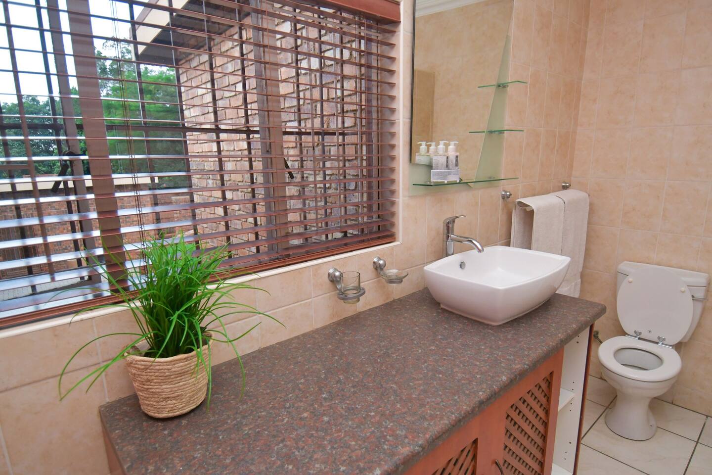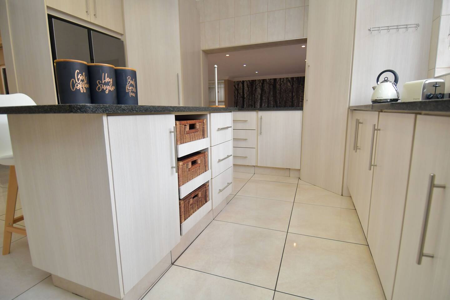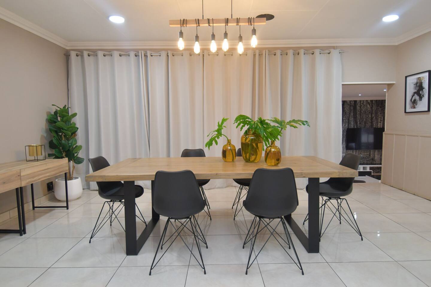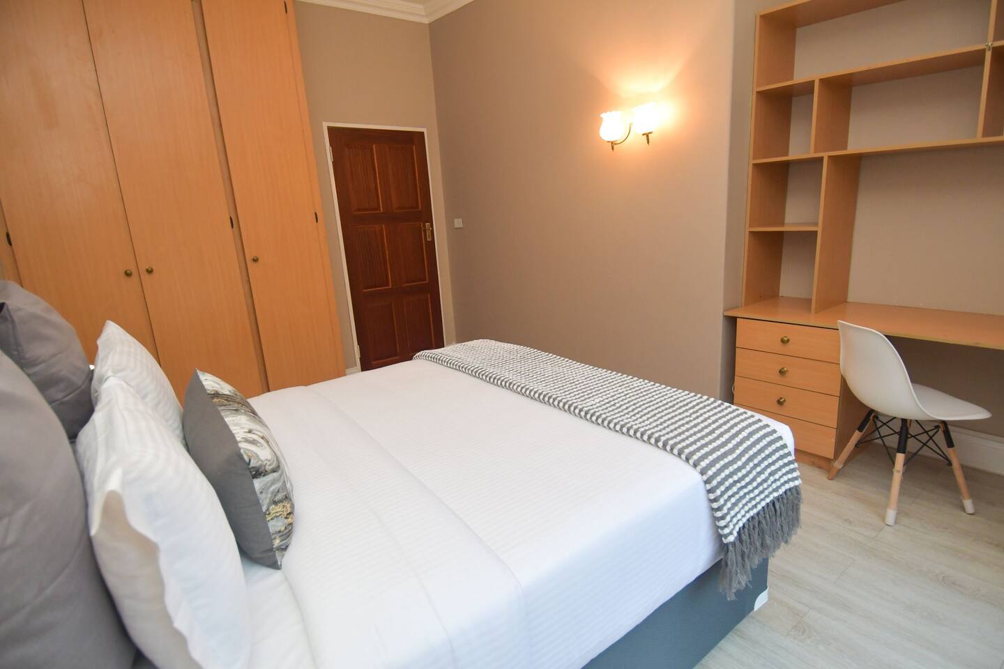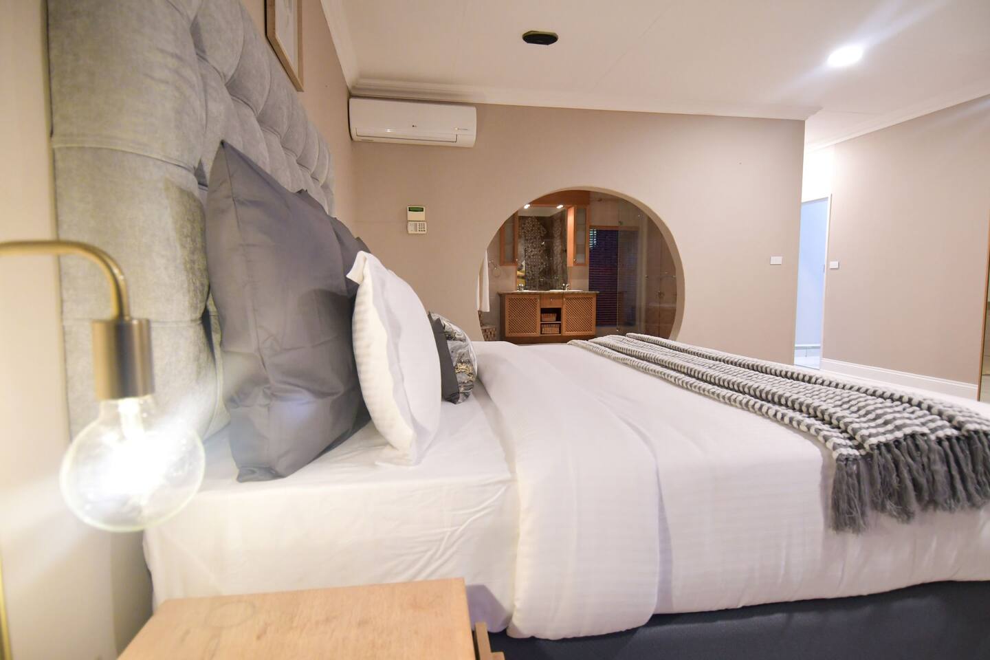 Soak up the modern and contemporary charm of this newly renovated and spacious home. Enjoy your stay without worrying about power outages as our property is equipped with a generator to keep lights, TV and essential appliances in working order. Play your favorite shows or music on Netflix, YouTube premium or DSTV on 2 TVs (65 and 55inch) via voice commands, all facilitated by a high speed (50mbps) uncapped and unshaped internet connection. Use you voice to turn on/off the lights as you please or have them turn on automatically in the morning to wake you up. Enjoy access to 2 living rooms, 2 kitchens and a gorgeous dining room. A full self catering unit is included if privacy is required within your group. The unit comes fully equipped with it's own living area, bedroom and bathroom. The house is cleaned and serviced 2 times a week at no additional cost. Sleep in bedrooms overlooking a beautiful garden, equipped with air conditioners and high quality mattresses while our fine bedding will carress you into a night of peaceful sleep.