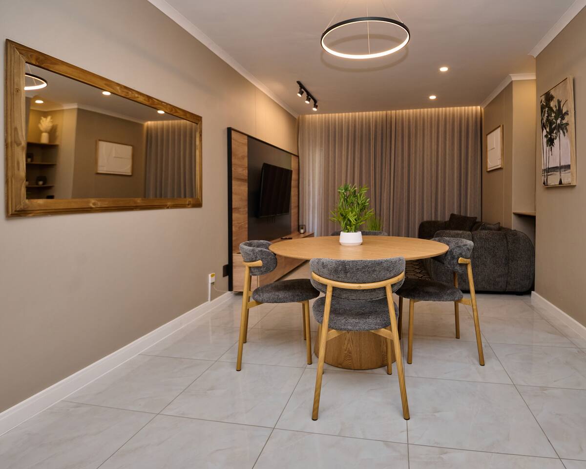 A cozy two-bedroom, two-bathroom apartment. Located in a charming and quiet building, our apartment offers a spacious lounge, a fully equipped kitchen, and a relaxing patio. Just steps away from Menlyn Mall and Sunbet Arena, you’ll have access to great shopping, dining, and entertainment. Perfect for both leisure and business travelers. Book your stay and experience Menlyn maine's best!